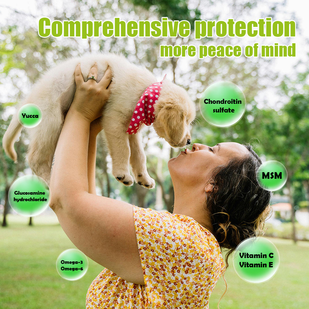 That joint “cushion” (cartilage) wears thin → stiff, sore steps.Joint Pup feeds the cushion (glucosamine+chondroitin), calms pain (MSM), cuts swelling (omega-3&6) — so your pup moves easy again.